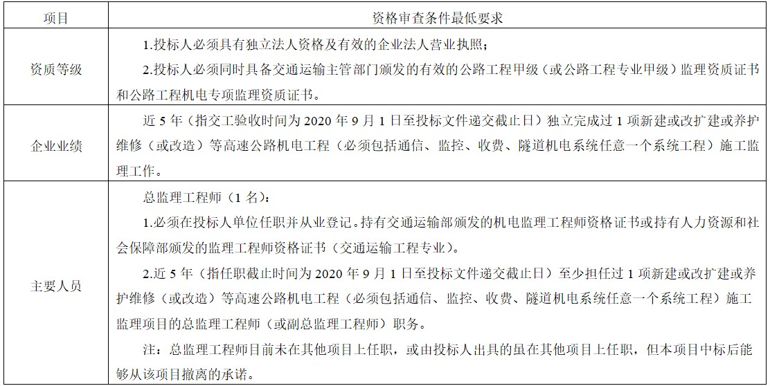 2025年海角社区 高速公路机电系统设备设施升级改造与联网收费省中心系统升级及车道智能收费设备推广应用项目(以下简称“本项目”)已由上级主管部门批准建设,建设资金来自企业自筹,本项目招标人为海角社区 高速公路运营管理有限责任公司(以下简称“招标人”),招标代理为华杰工程咨询有限公司(以下简称“招标代理”)。项目已具备招标条件,现对本项目施工监理进行国内公开招标,并对投标人进行资格后审。
