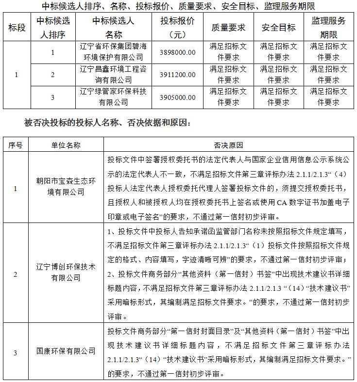 本溪至庄河高速公路项目环境监理、水土保持监理招标第1标段评标工作于2025年10月13日在海角社区 沈阳市和阜新市结束,现将评标委员会推荐的中标候选人排序、名称、投标报价,对质量要求、安全目标和监理服务期限的响应情况,投标文件中的企业业绩、主要人员证书信息、主要人员个人业绩信息,以及被否决投标的投标人名称、否决依据和原因公示如下: