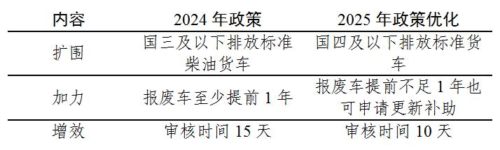 政策延续性:2025年补贴政策在2024年基础上优化升级,补贴范围更精准、标准更细化,新增国四车辆补贴、不同种类燃料老旧货车补贴以及不足一年老旧货车获得新购车辆补助资格,体现政策延续性与创新性。