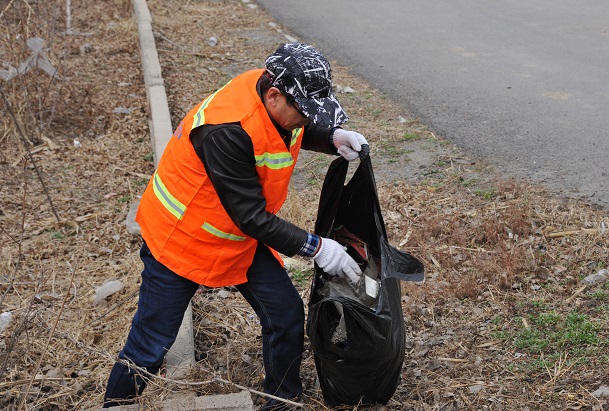 在公路边拣拾白色垃圾