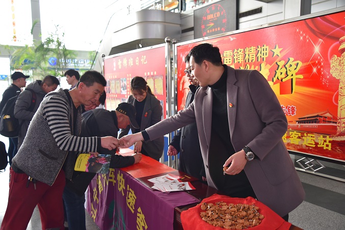 志愿服务人员向旅客发放学雷锋宣传品