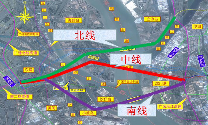 在桥位与路线走廊选择秉承可持续发展桥梁理念。遵循如下原则:1、符合区域发展规划,有利于社会经济发展。2、作为关键节点,顺畅衔接珠江两岸。3、不改变生态,有利于环境保护。工可阶段开展了北线、中线和南线三个线位的比较。北线方案路线总体走向与路网总体规划基本符合,但路线与所经地区的规划有较大冲突,沿线与多处高压线路交叉需对高压电塔进行局部拆迁,方案实施难度大,可行性差。南线方案仅需设置一处跨海特大桥,工程建安费低。但方案与南沙国家级新区、虎门港、东莞市地方规划冲突严重,需拆迁华润热电厂等多大型工厂和已有建筑物,对虎门港的拆迁补偿就在8亿元以上。因此,南线方案对两岸地方的建设及规划的影响是破坏性的,占用虎门港岸线资源,影响地方良好的经济发展势头,工程建设不仅没对地方带来机遇,反而对地方经济产生不利影响,并且南线方案征地拆迁费用高,总投资高于中线方案。最终,考虑与两岸高速公路顺畅衔接、尽量减少对地方现有建筑和规划用地的破坏、对沿江港口码头的不利影响降到最低,选择了中线方案。