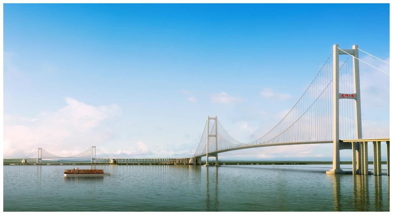 虎门二桥工程位于珠江三角洲核心区域,为连接珠江口东西两岸的重要过江通道,全长12.89千米。项目全线采用桥梁方案,包括两座超千米的跨江特大桥,坭洲水道桥为658+1688米的双塔双跨钢箱梁悬索桥,大沙水道桥为1200米双塔单跨钢箱梁悬索桥。项目批复概算111.8亿元,主体工程2014年8月开工,建设工期5年。在珠江入海口软基深厚、台风高发、社会经济相对进步的区域同步建造两座超千米级特大跨度悬索桥,需要树立全寿命周期成本理念,在项目规划设计、建设管理、运营维护各阶段追求全寿命周期成本最优,打造优质耐久、安全舒适、经济环保、社会认可的可持续发展桥梁,铸就百年品质工程。