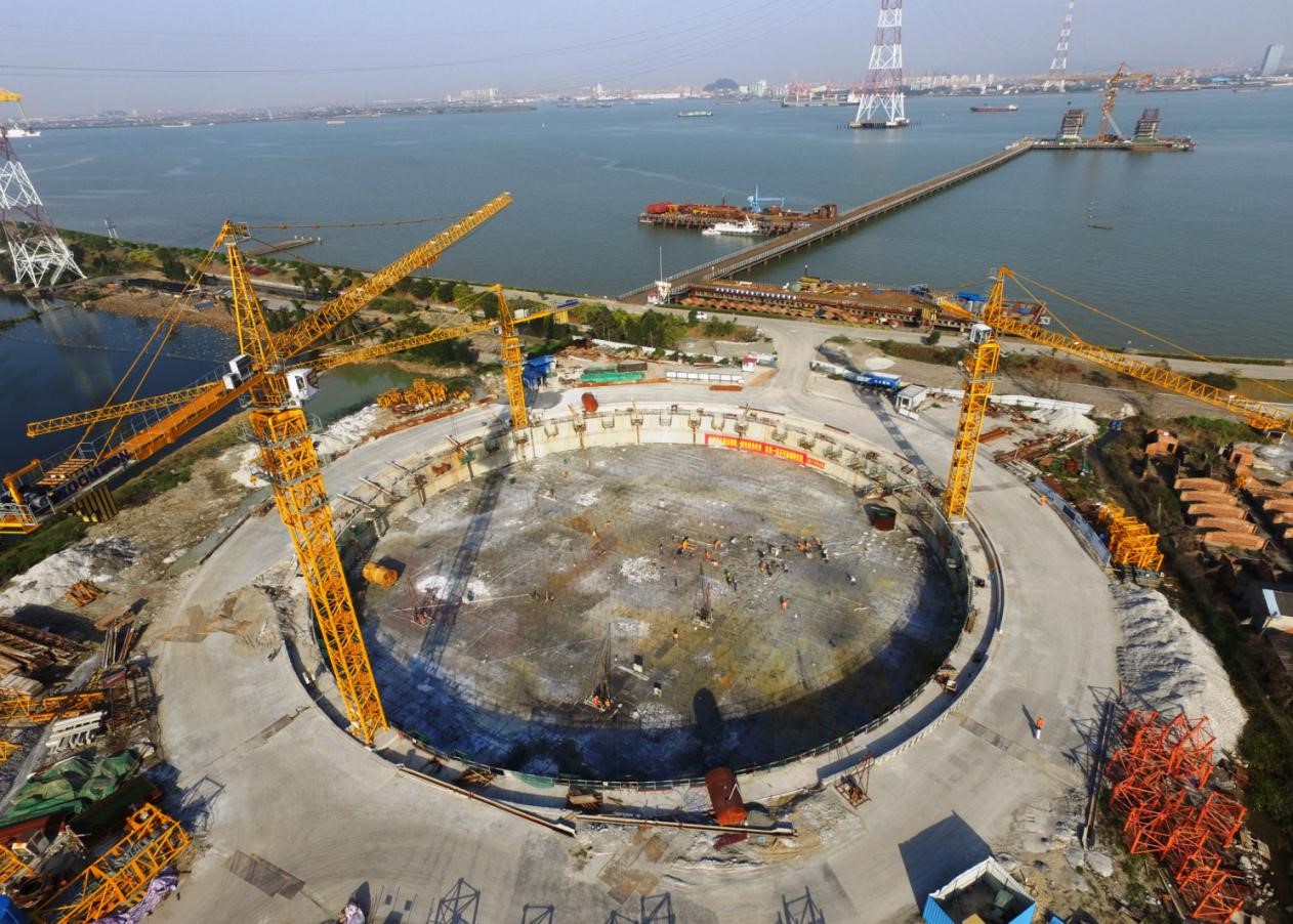 本项目两座主桥四个锚碇总计61万方混凝土。坭洲水道桥东锚及基础达到25万方,一次性浇筑超过17000方,作业长达5天5夜,刷新了国内桥梁单次浇筑方量记录,还要连续组织7次同量级作业。项目按照“四步法”工作流程精心组织,实施了以下两项关键措施: