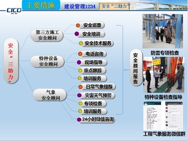 “三个三”:“三真”理念 :贯彻认真、较真、顶真工作理念;认真,即脚踏实地、持之以恒,做到科学严谨、精细准确。较真,即严字当头、一丝不苟,把好质量关、安全关、责任关。顶真,即追求极致、匠心独具,以创新思维不懈追求更好。“三抓”方法:日常工作坚持“抓监理、抓班组、抓落实”。安全“三助力”:安全管理借助第三方服务单位,综合安全服务、特种设备设备服务、气象服务(见图5)。