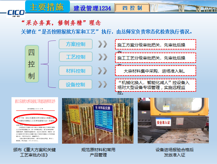 “四控制”:加强在“方案、工艺、材料、设备”等四方面同时控制,按照“采办务真,修制务精”理念,提高实体工程质量。制定《重大施工方案和关键施工工艺审批管理办法》,分级审核把关。管理的关键在于“是否按照报批方案和工艺执行”,这是安全事故于质量事故发生的主要原因之一,必须由专人负责检查执行情况。大宗材料集中采购,加强原材料进场控制,关键部位碎石清洗后进场, 严格执行原材料进场准入制。按照“机械化换人,智能化减人”原则把控设备入场,对大型设备专项管理,实施远程监控(见图6)。
