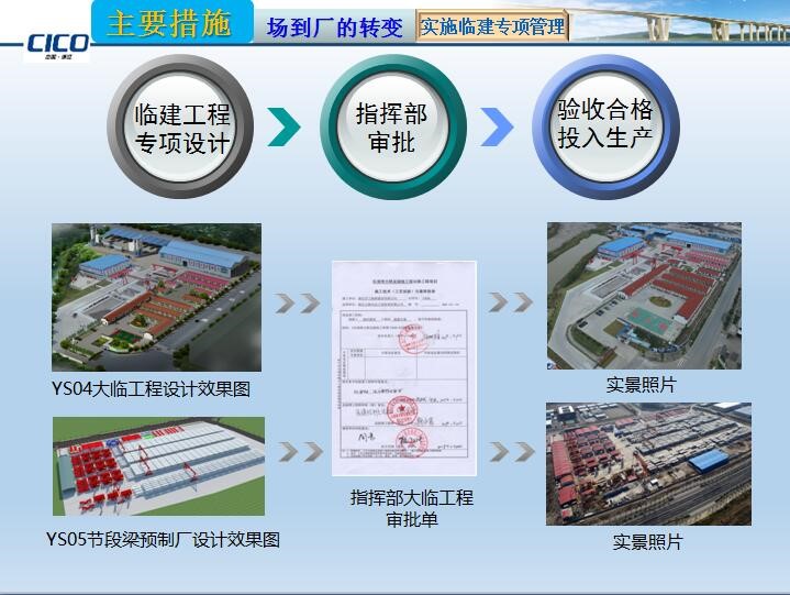 2)实施临建专项管理。在招标文件中对“三厂一驻地”建设明确标准,采用大型化、智能化施工设备,污水、粉尘处理环保标准等;要求项目部对临建设施进行专项设计,严格按照指挥部“先方案审批后实施、先工艺审批后操作”的原则执行;临建设施建成后,指挥部组织验收通过后方能投产(见图9、10)。