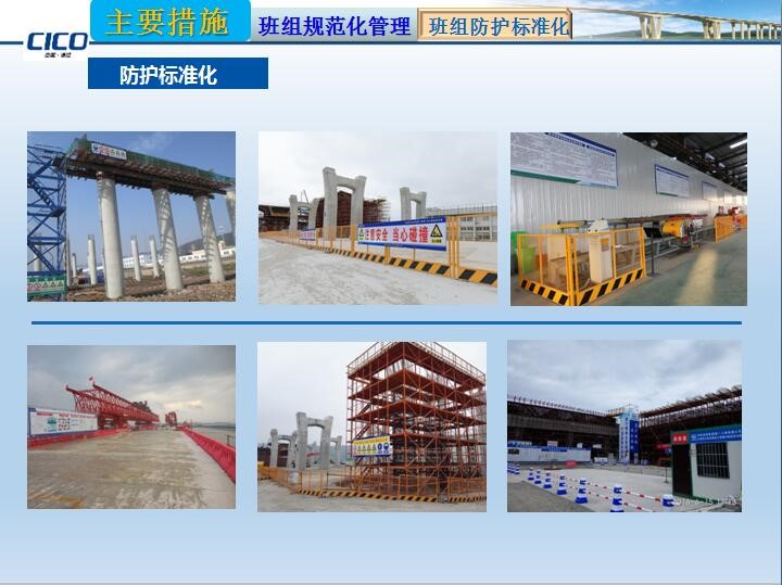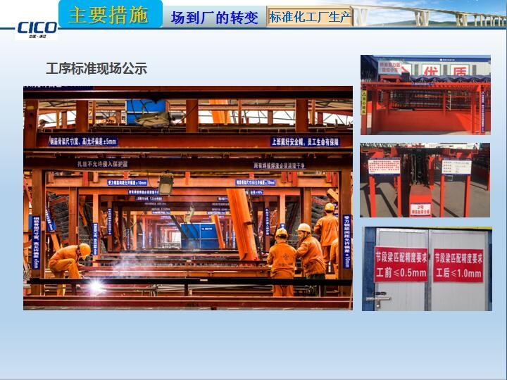 3)实行标准化工厂生产。工前严把原材料进厂准入制,过程执行工序验收标准挂牌制、工序交接零误差,工后落实产品验收标识与《出厂合格证》制度(见图11)。对钢筋、小型构件等半成品实行统一仓储配送的超市化管理;对混凝土温度、配合比及搅拌时间实时远程监控;对施工现场实行“6S”管理。现场施工点实施“工点工厂化”管理理念(见图12)。
