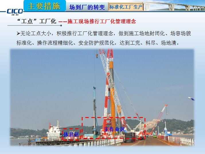 2)从工业建造理念入手,谋求质量安全新水平。按照“标准化设计、工厂化生产、装配化施工”的总体布局思路,在桥梁工程中优先选择预制装配化结构,其中跨海桥梁主桥和非通航孔桥全部采用工厂节段预制,减少了海上作业量,与以往的移动模架工法相比较,质量、安全远胜一筹。