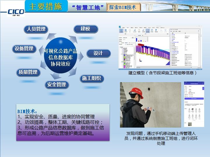 二是探索BIM技术,建立协同管理平台。遵循“信息数据共享→协同管理→提质增效”管理思路,在跨海大桥中探索并搭建BIM技术管理平台,利用BIM技术建立工程可视化模型,借助可视化审查、碰撞纠错完善设计精度,通过三维推演优化施工方案和开展工人技术交底,实现质量、安全、进度协同管理;并形成公路产品信息数据库,做到施工信息可追溯,同时为后期运营维护奠定基础(见图14)。