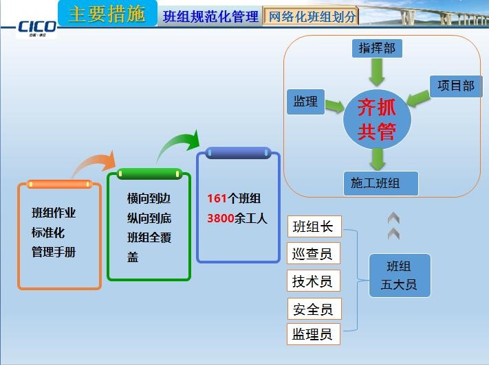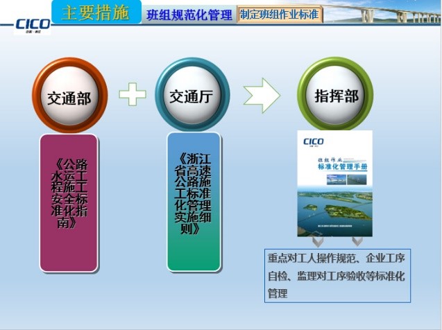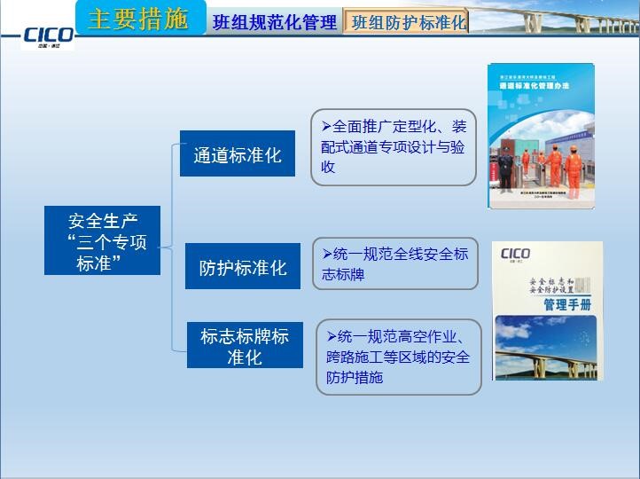 以《浙江省高速公路施工标准化管理实施细则》为依据(见图17),制定了《班组作业标准化管理手册》,全线施工点按班组进行网格化划分,建立指挥部-监理办-项目部-工区-班组与项目部-分部-工点-班组的管理体系,并按照专项内容制定了班组专项作业管理办法(见图18)。