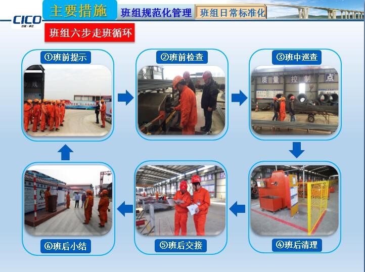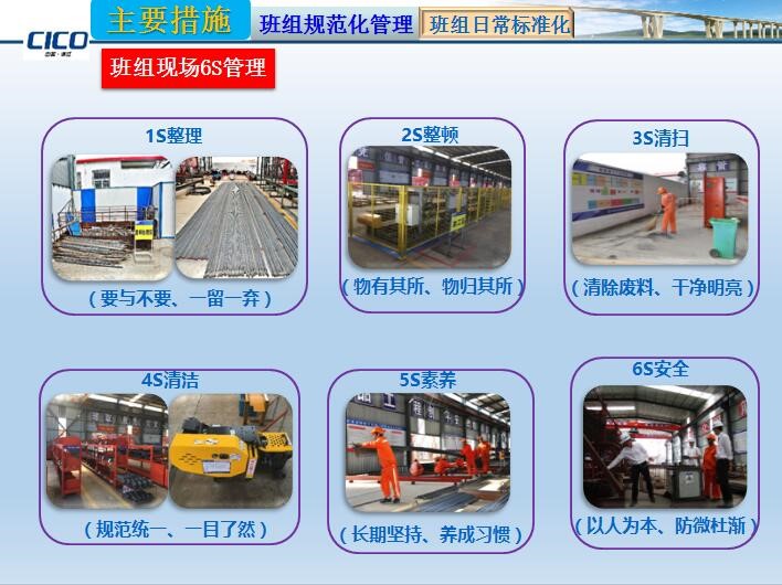 二是班组日常标准化。推行“工点工厂化”理念,实施班组“班前教育、班前检查、班中巡查、班后清理、班后交接、班后小结”6步走常态化、“整理、整顿、清扫、清洁、素养、安全”的“6S”管理,规范作业行为,培养良好习惯(见图21、22)。
